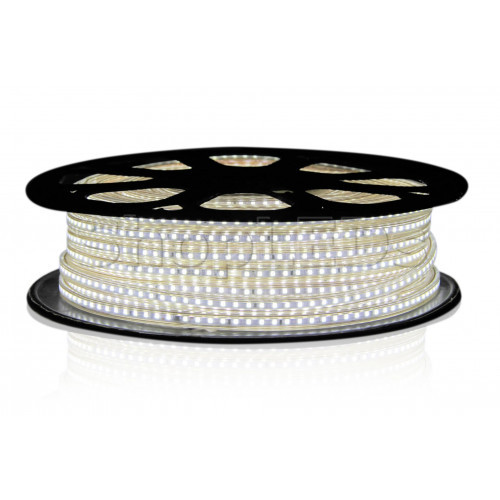 Светодиодная лента на белом основании, входное напряжение 220V, 120 светодиодов на метр, мощность 9,6Вт/м, размеры 50000x10x5.5мм, степень защиты IP67.